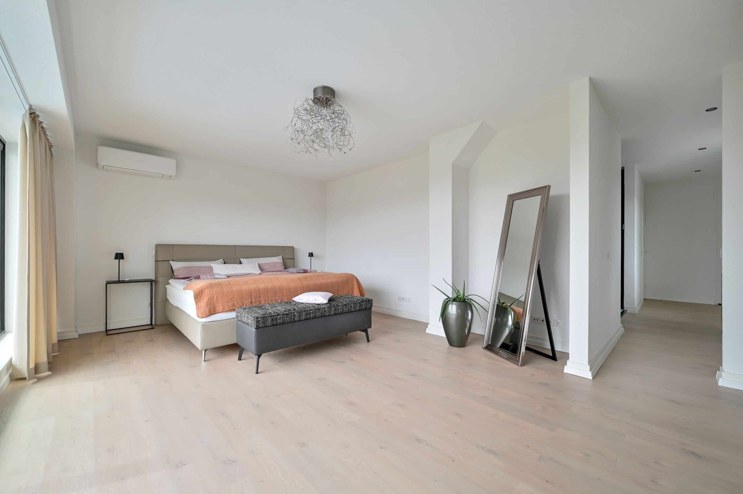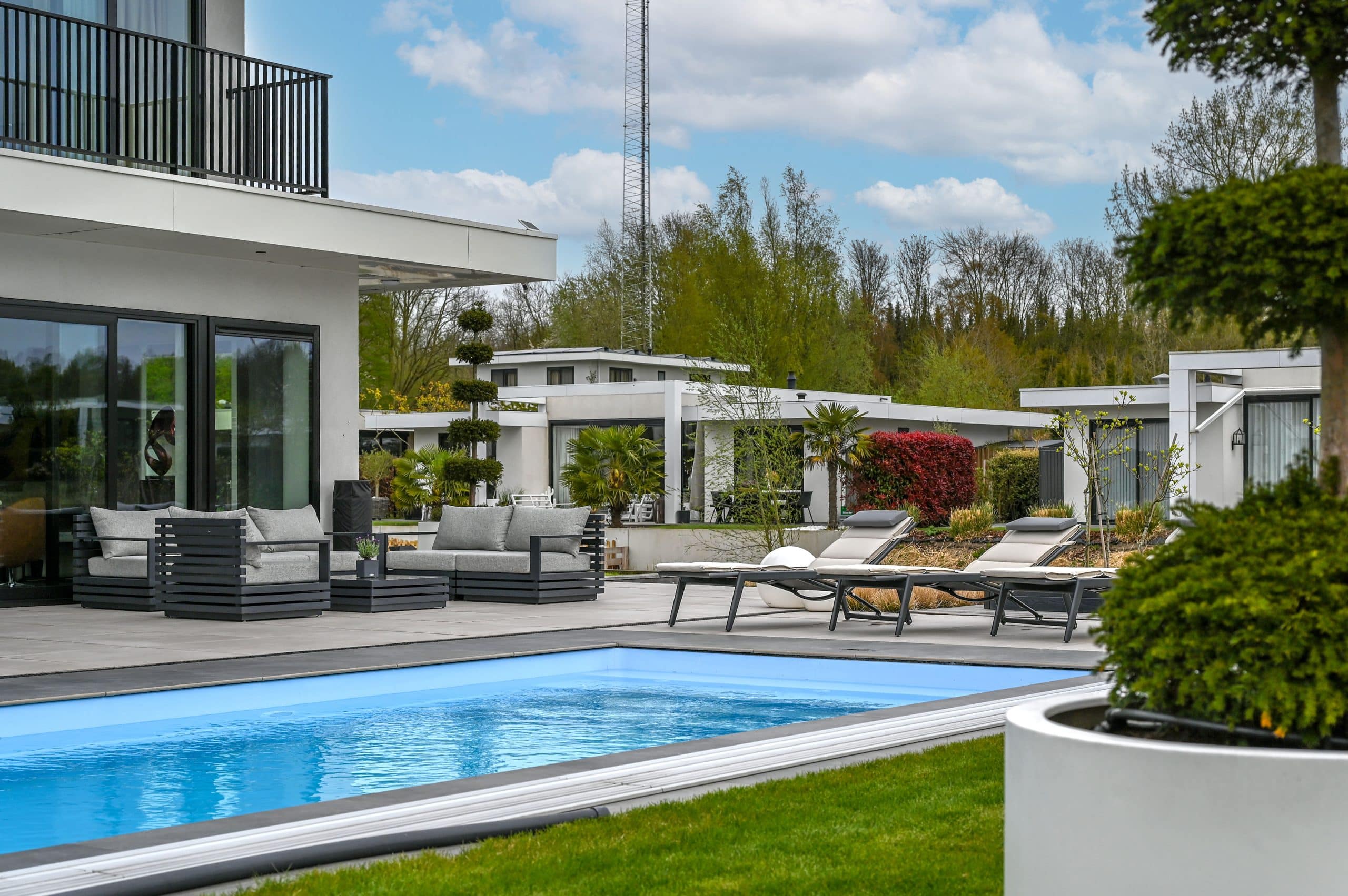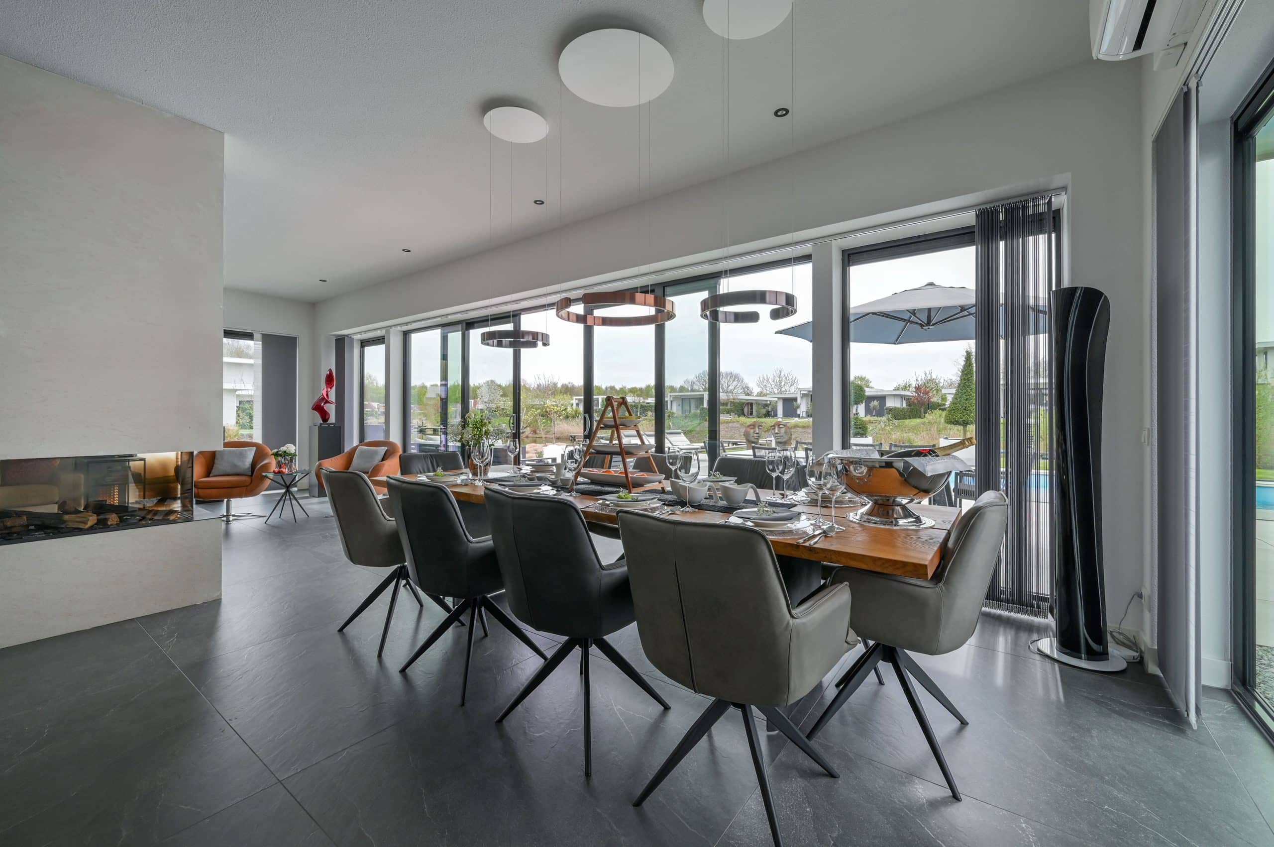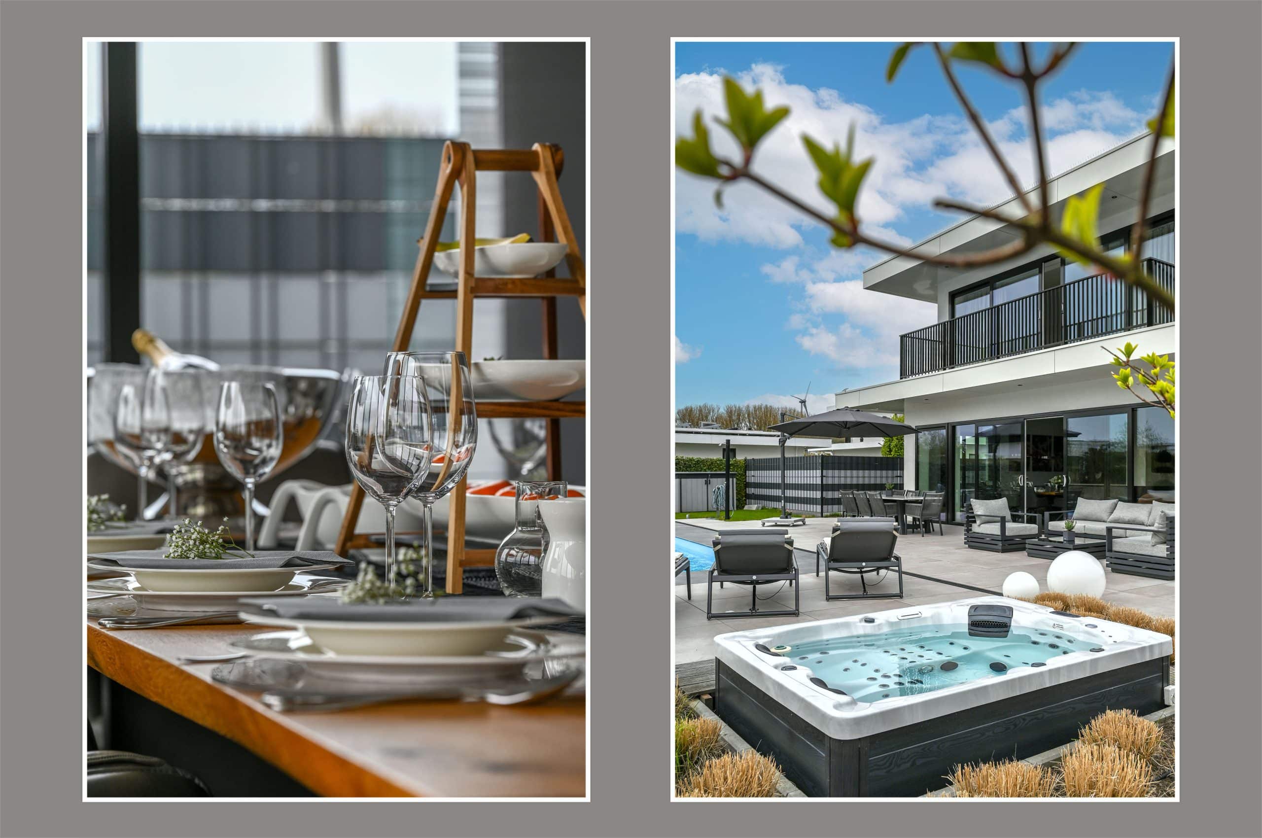 Overdekt en verwarmd buitenzwembad, jacuzzi, schuifpui, vloerverwarming, mechanische ventilatie, horren voor de schuifpui???, zonnepanelen (26 stuks), airconditioning in alle kamers, maairobot, pompinstallatie besproeiing, ruim terras met tuin op het zuiden.