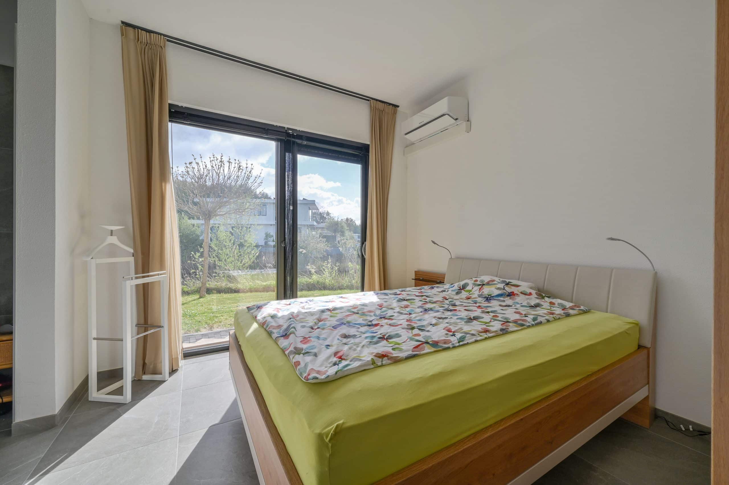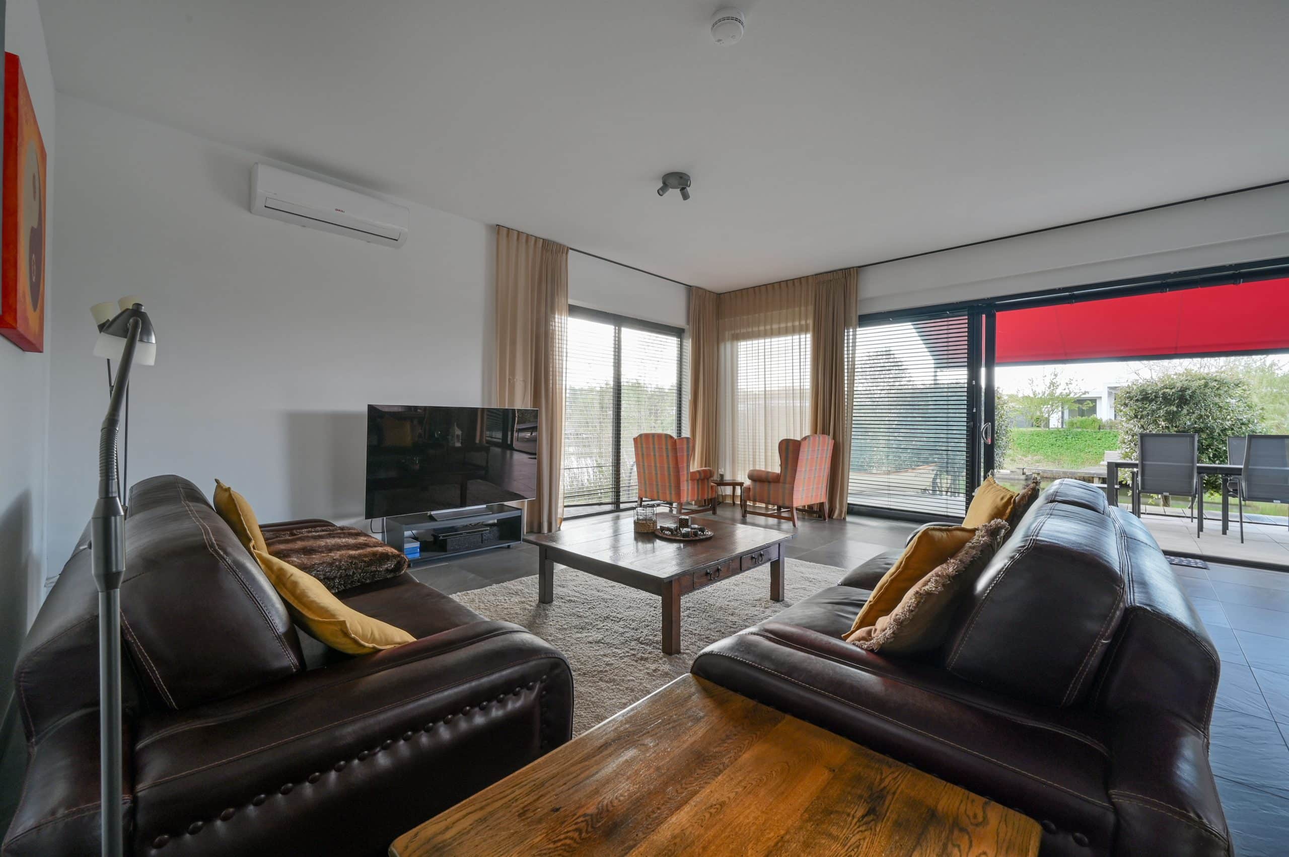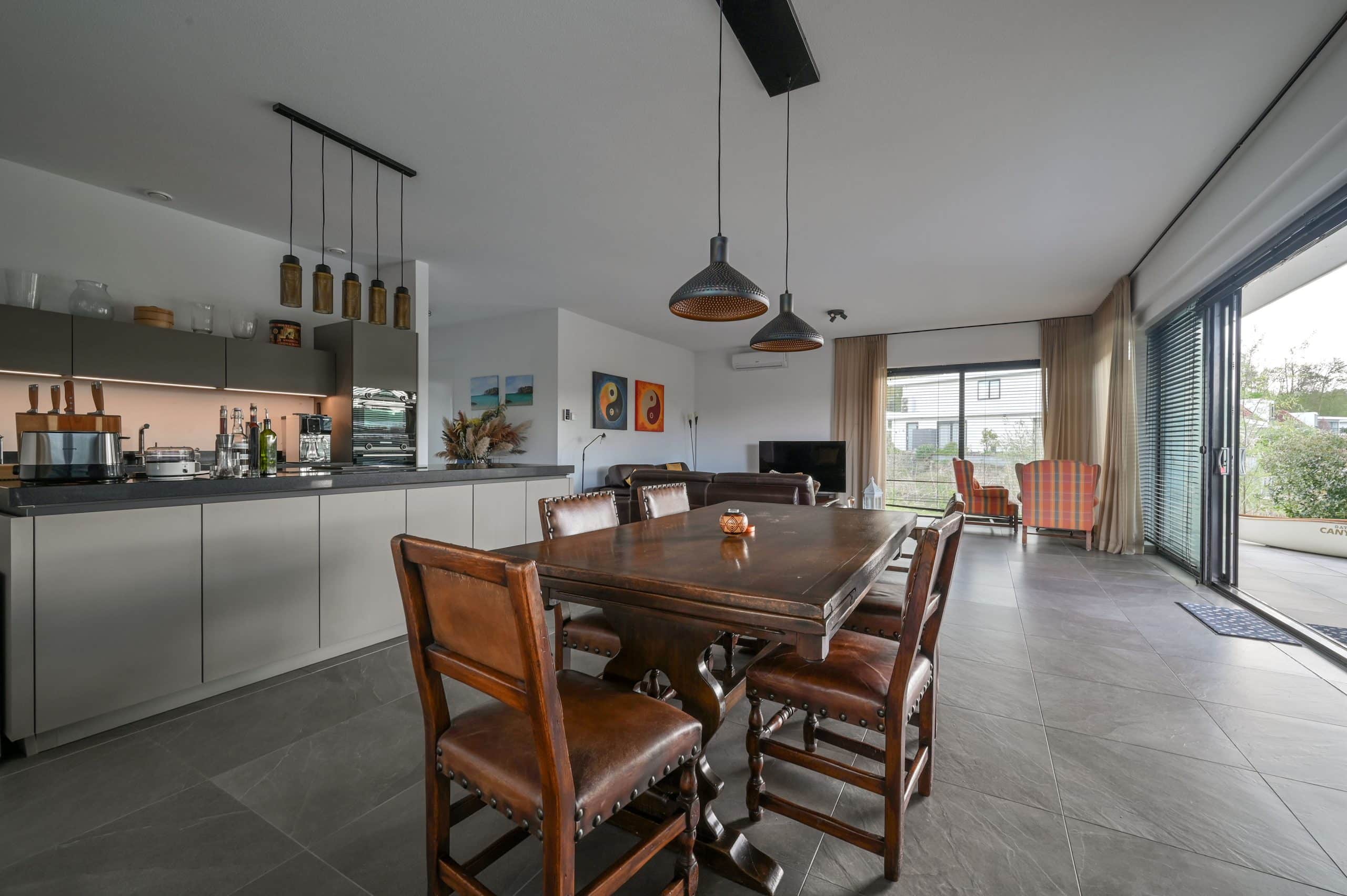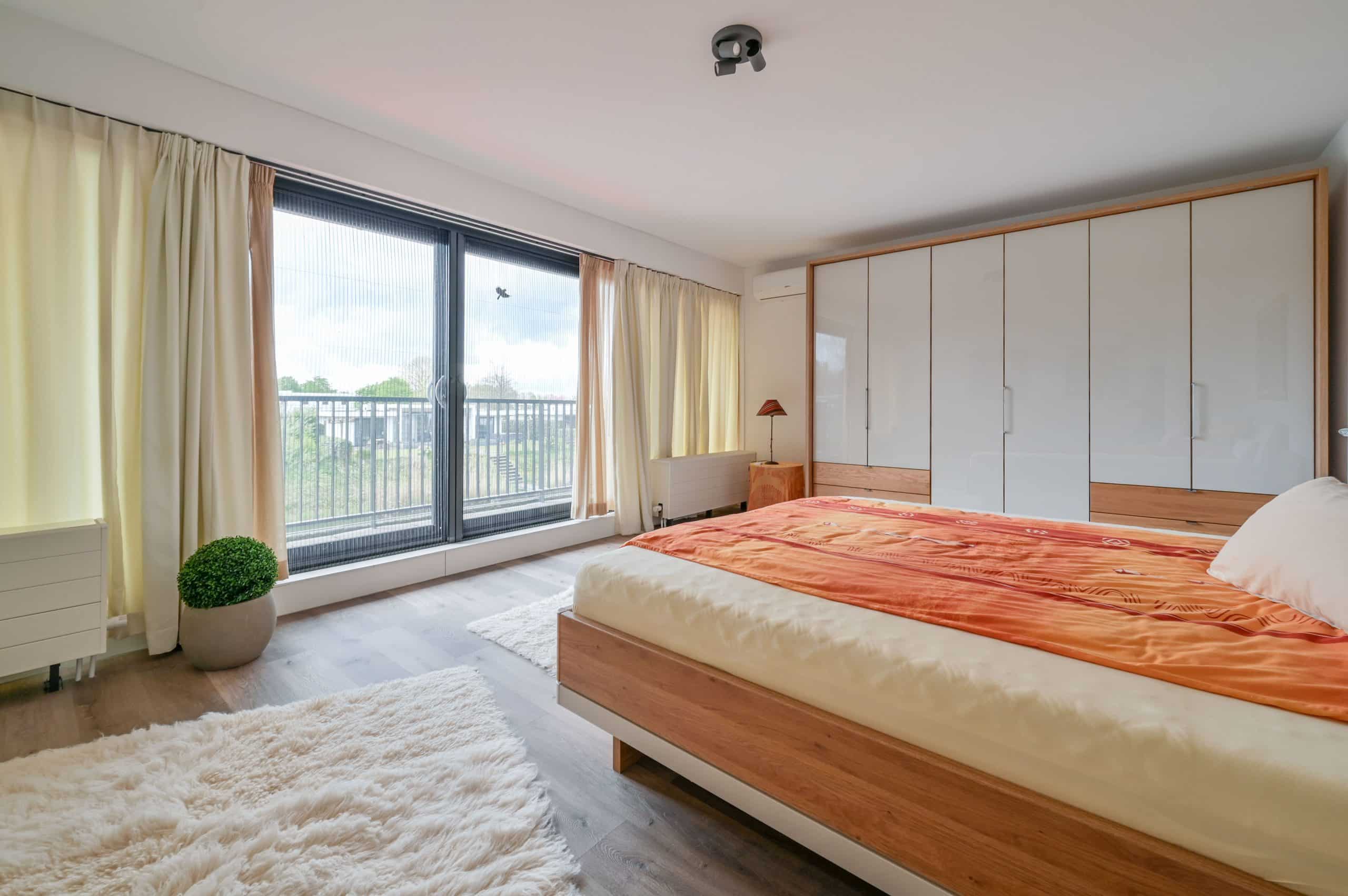 Schuifpui, met horren, vloerverwarming, mechanische ventilatie, airconditioning in alle kamers, pompinstallatie besproeiing, ruim terras met tuin op het zuiden, zonnescherm.