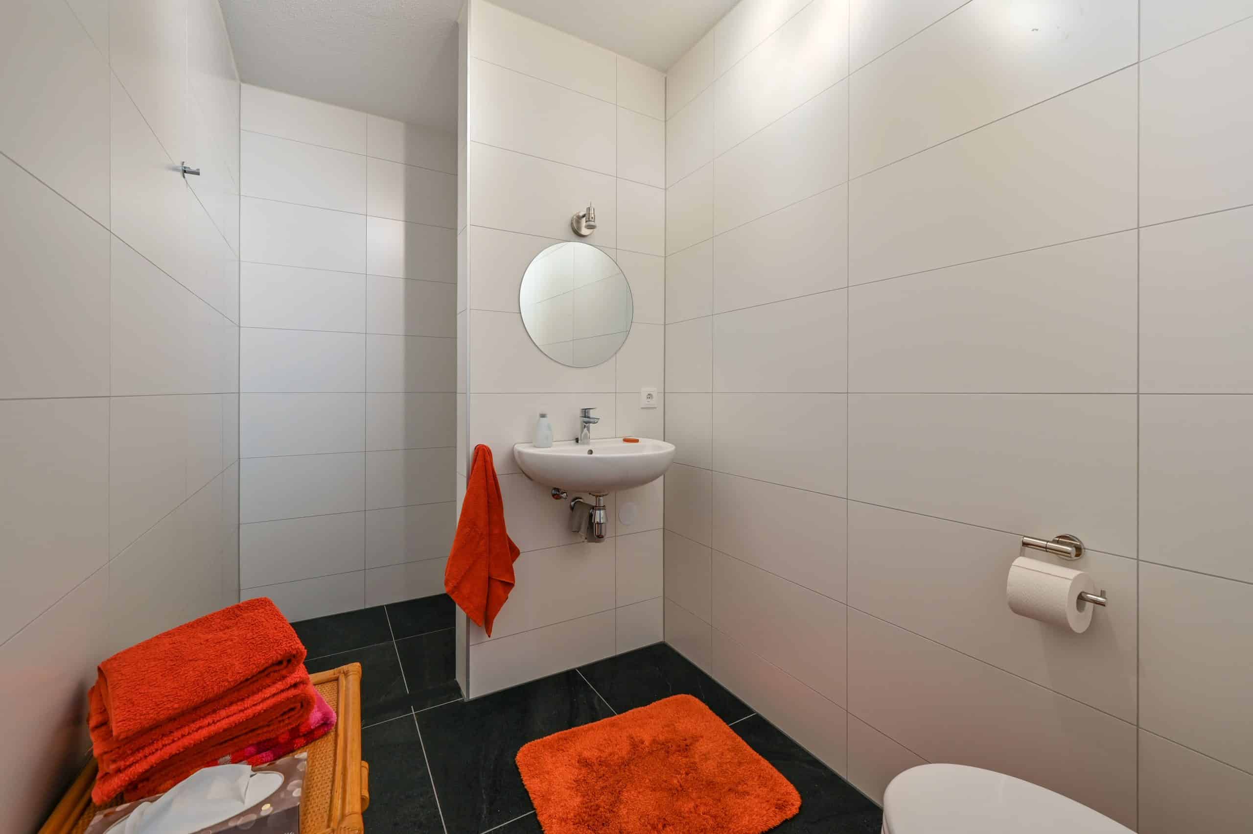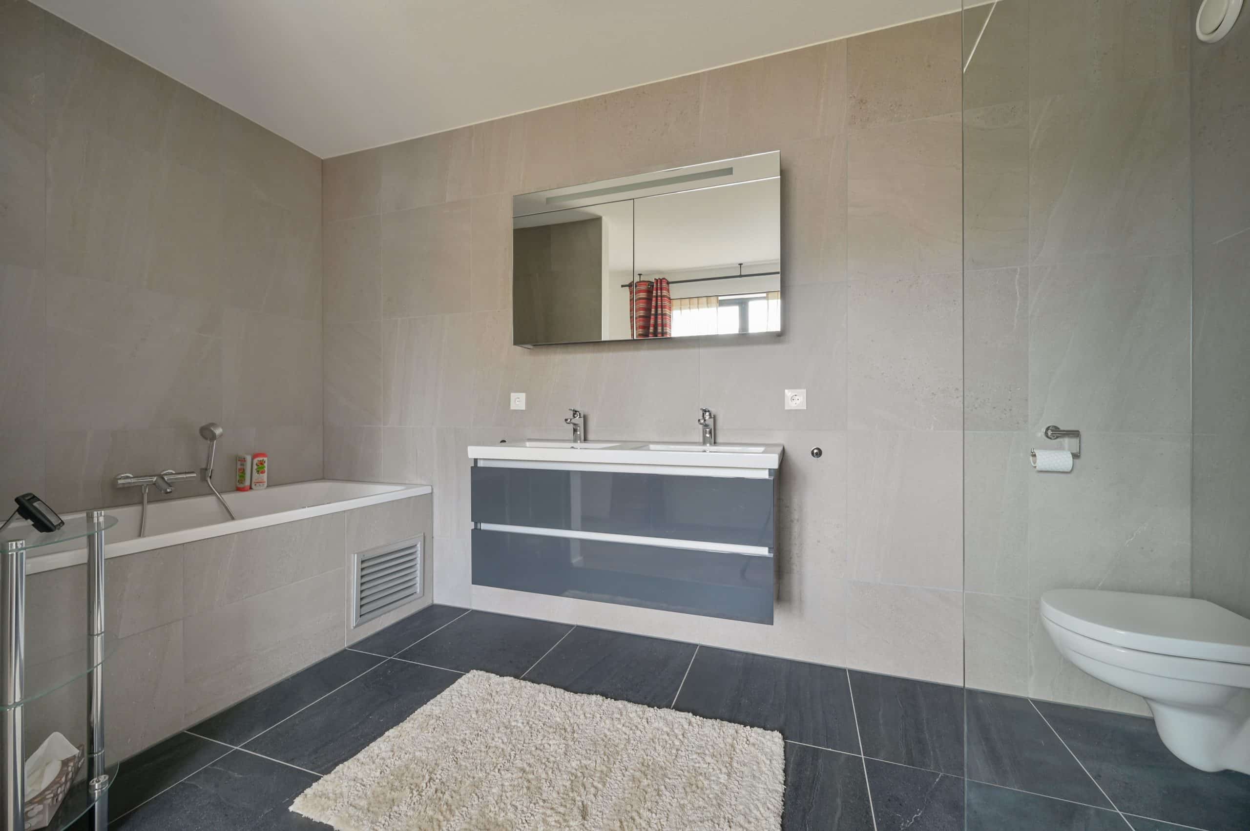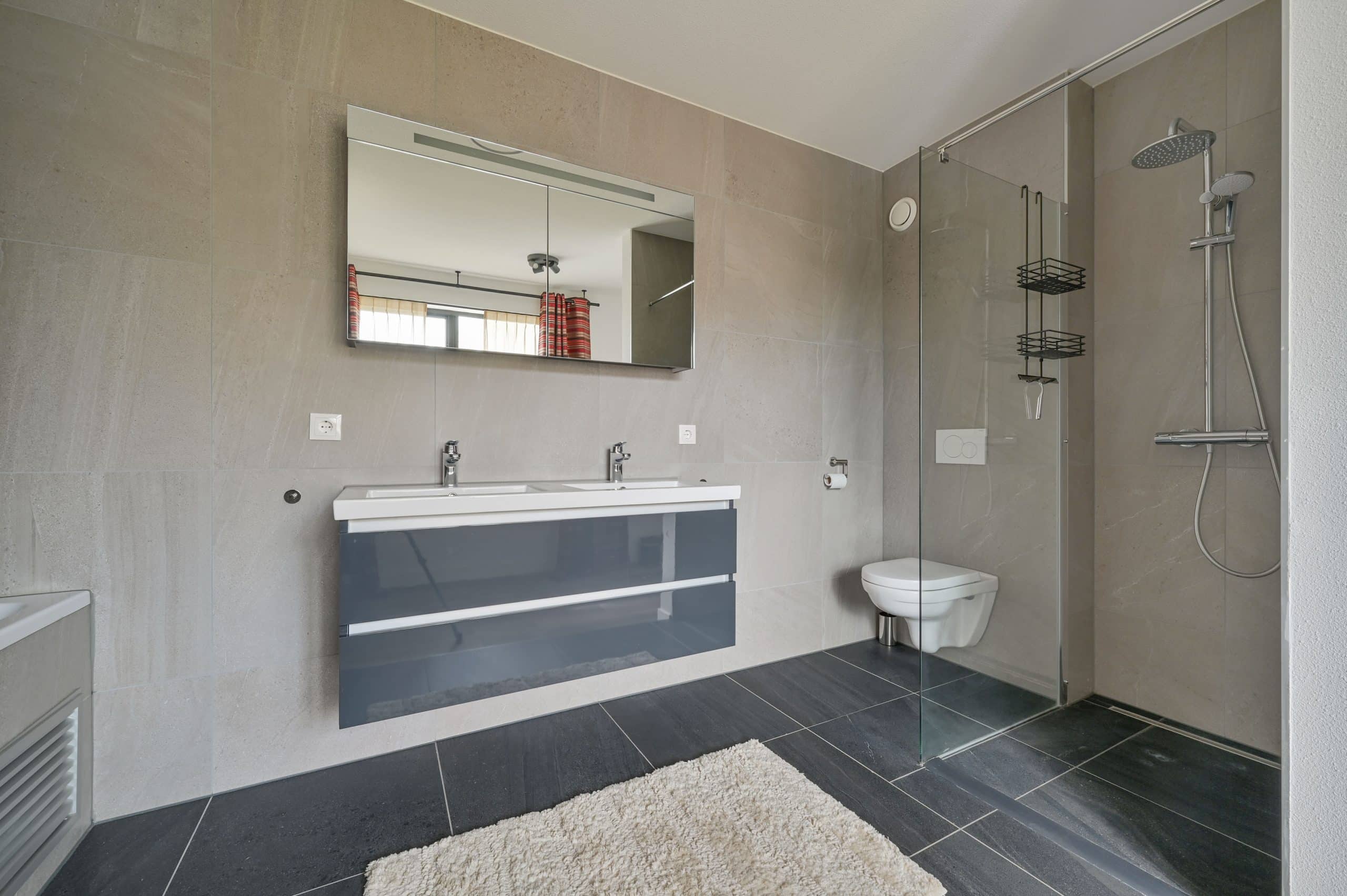 Inloopdouche, dubbel wasmeubel, ligbad, toilet en vloerverwarming